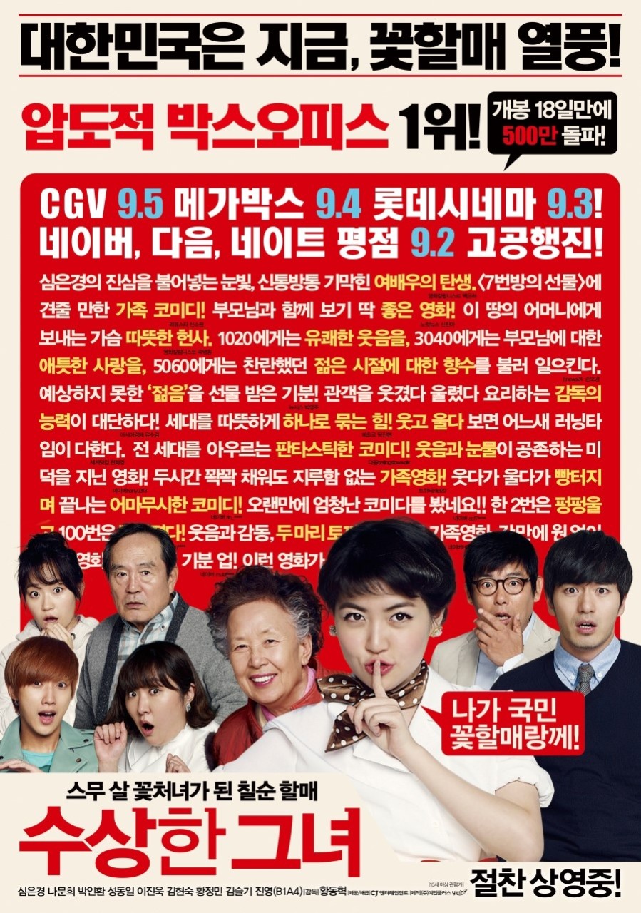 '수상한 그녀'는 개봉 이후 국내외를 매료시킨 가슴 따뜻한 한국 코미디 드라마이다. 황동혁 감독이 연출한 고집스럽고 재치 있는 74세 여성 오말순이 마법처럼 스무 살의 자신의 몸에서 자신을 발견하게 되는 유쾌한 이야기를 담고 있다. 독특한 전제와 감동적인 유머, 감동적인 울림으로 마음을 사로잡으면서 전 세계적으로 흥행 성공과 다수의 리메이크를 이끌어냈다. 코미디와 진심 어린 순간을 혼합한 팬으로서 잘 짜인 내러티브, 공감할 수 있는 주제, 뛰어난 연기가 어떻게 결합되어 잊을 수 없는 경험을 만들어 낼 수 있는지를 보여주는 완벽한 예라고 생각한다. 매력적인 스토리라인부터 뛰어난 연기력, 보편적인 매력까지 흥행하게 만든 핵심 요소를 살펴보겠다. 성공을 뒷받침하는 가장 강력한 요인 중 하나는 판타지와 공감할 수 있는 경험을 결합한 독특한 콘셉트이다. 74세 할머니가 갑자기 젊음을 되찾는다는 중심 전제는 다른 코미디와 단번에 차별화되며 신선하고 흥미로운 반전을 선사한다. 이 마법 같은 변화를 통해 유머러스하고 감동적인 렌즈를 통해 노화, 가족 역학, 시간의 씁쓸함과 같은 보편적인 주제를 탐구할 수 있다. 청춘의 두 번째 기회를 제시함으로써 자신의 삶과 그들이 내린 선택에 대해 성찰하도록 유도하면서 공통된 환상을 활용한다. 유머와 진심 어린 순간의 균형을 맞추는 능력은 가장 큰 장점 중 하나이다. 오말순은 젊은 여성으로서 새로운 삶을 살아가면서 자신의 열정을 재발견하는 기쁨을 경험하는 동시에 자신의 진정한 정체성을 숨겨야 하는 어려움에 직면한다. 코미디와 드라마의 이러한 혼합은 종종 웃음의 순간과 반성의 순간이 공존하는 실제 삶의 복잡성을 반영하므로 청중에게 깊은 울림을 준다. 세대 간 격차, 이루지 못한 꿈, 가족에 대한 변치 않는 사랑과 같은 주제를 탐구하는 접근성과 정서적 몰입도를 높여 모든 연령대의 이야기 속에서 공감할 수 있는 내용을 찾을 수 있도록 해준다.